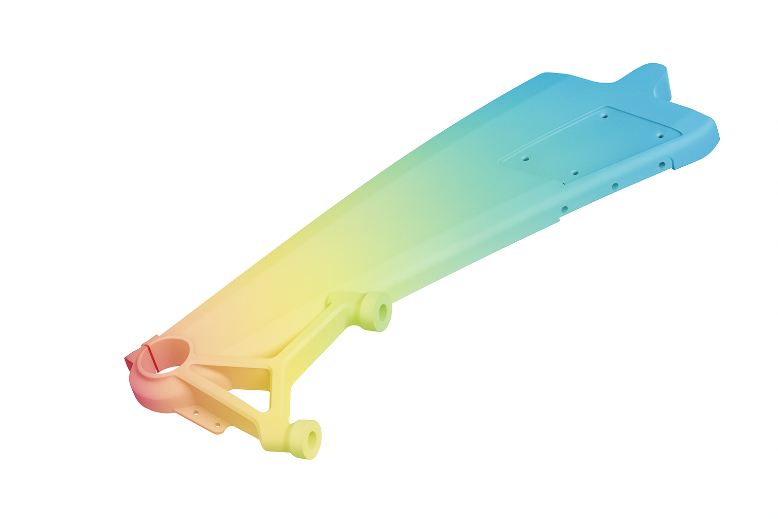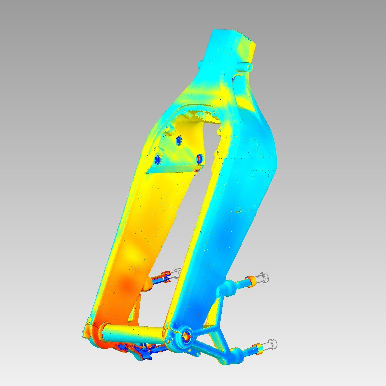 The image below shows the CAD model and the scanned part overlaid. The light blue areas correspond to the CAD model, while the yellow, orange, and red colors represent the real part. The largest differences are found around the wheel axle area.